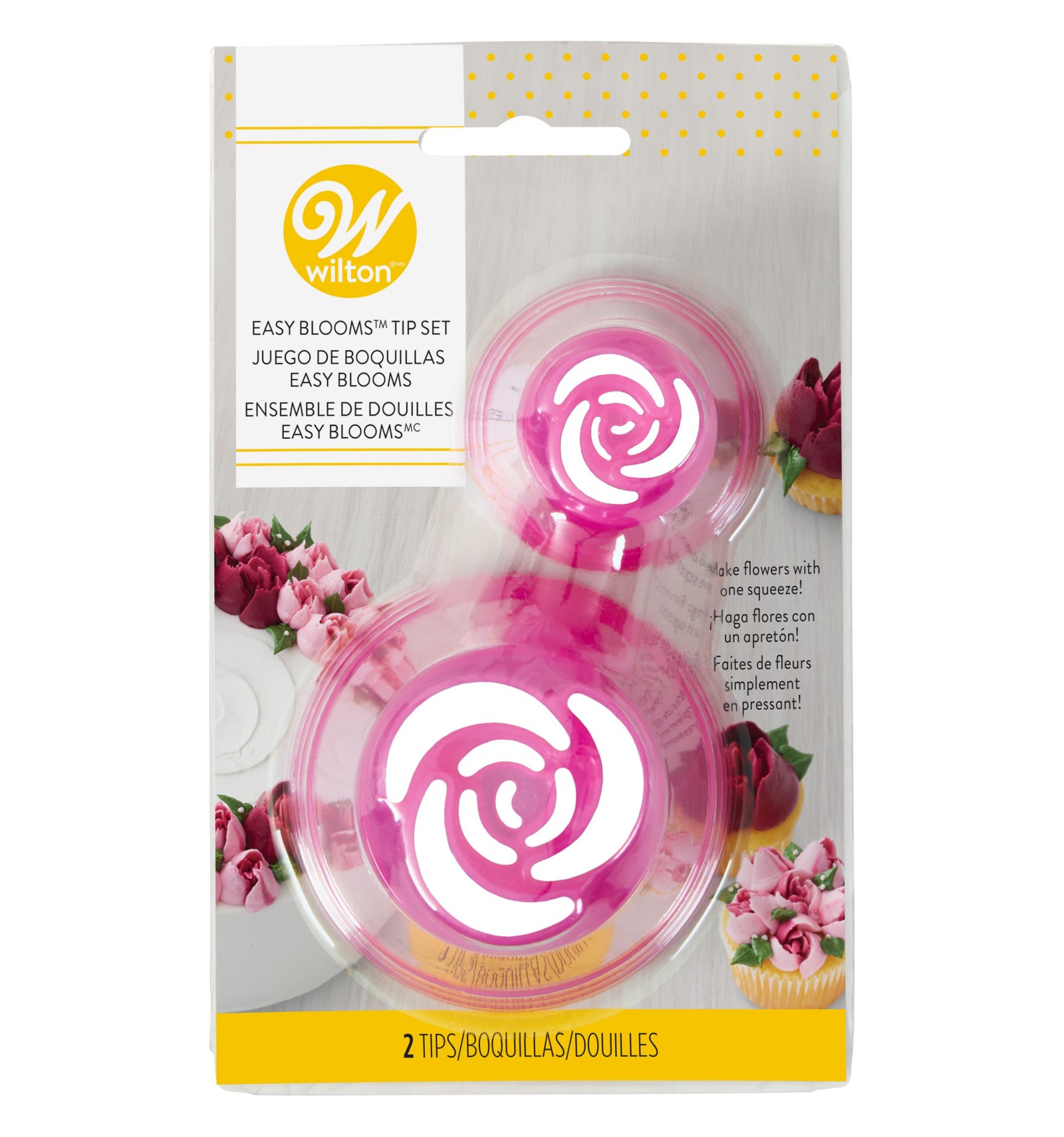 Crea elegantes rosas en tus tartas y cupcakes con un solo apretón utilizando estas boquillas Easy Blooms™.