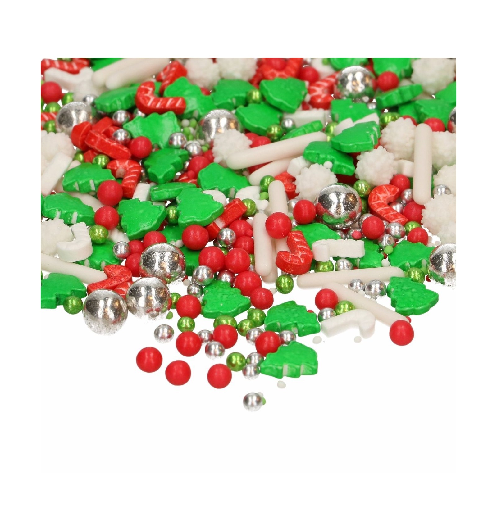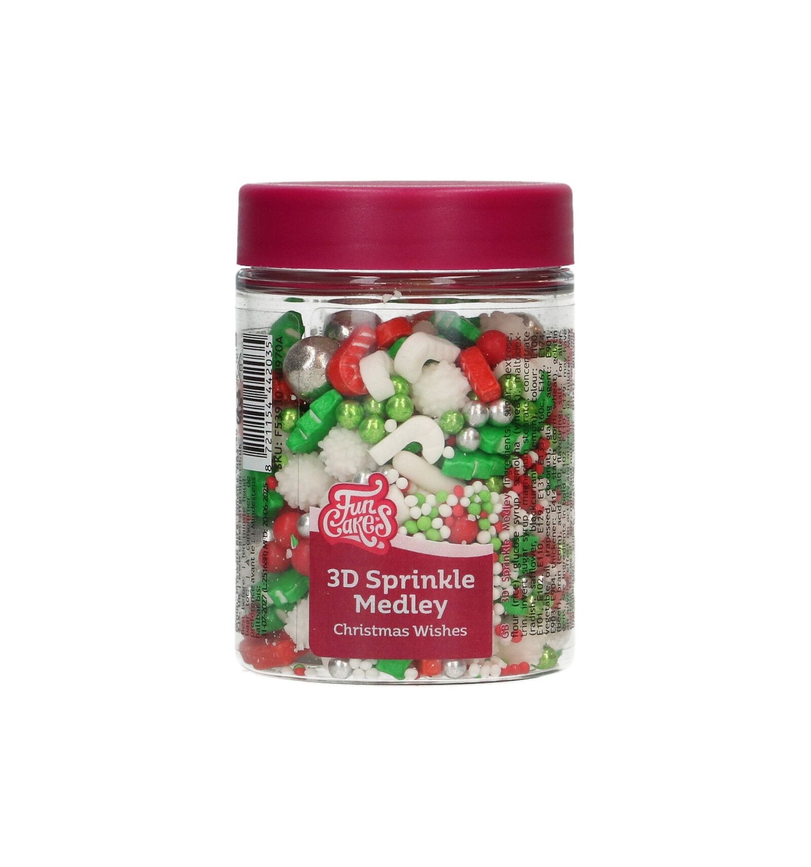FunCakes 3D Sprinkle Medley – Christmas Wishes es la forma más fácil de dar a tus dulces navideños un toque alegre y festivo. Sprinkles rojos y blancos, perlas brillantes y pequeños arbolitos verdes decorativos traen toda la magia navideña a tus creaciones. Esta mezcla forma parte de nuestra gama premium, reconocible por el tarro con tapa morada.